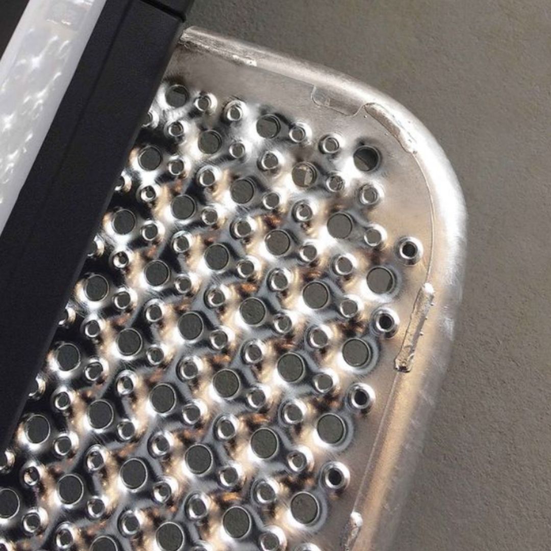 Die rutschfeste Trittfläche gewährleistet sicheren Halt bei jeder Witterung. Durch die offene Struktur wird verhindert, dass sich Schmutz, Wasser oder Schnee ansammeln, was die Sicherheit zusätzlich erhöht.